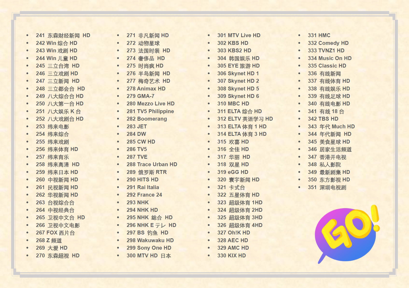 GoTV电视直播APP软件,提供350多套欧美、港台、大陆、日韩高清精华频道,新增300多套4K超高清频道!支持各种安卓(Android)机顶盒/安卓手机/安卓平板/安卓电视(包含小米机顶盒、小米手机、小米平板、小米电视、腾讯机顶盒、创维机顶盒、天猫魔盒、谷歌机顶盒等安卓(Android)设备)。